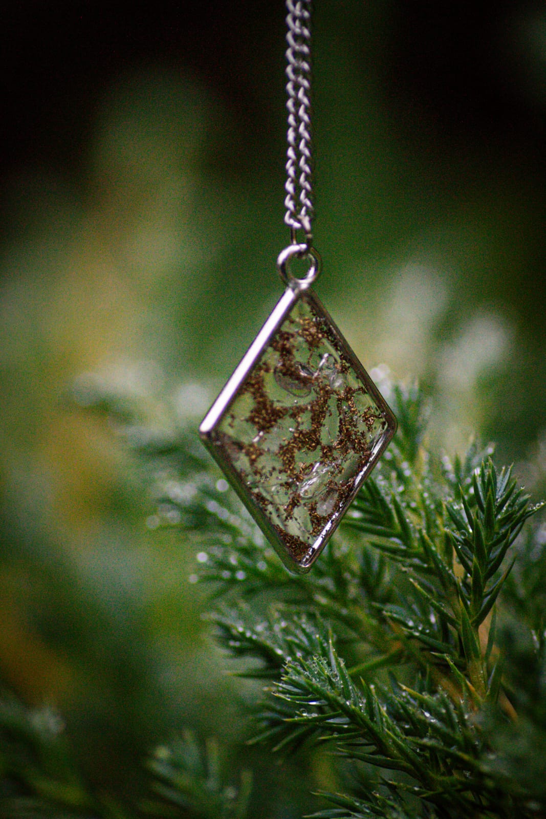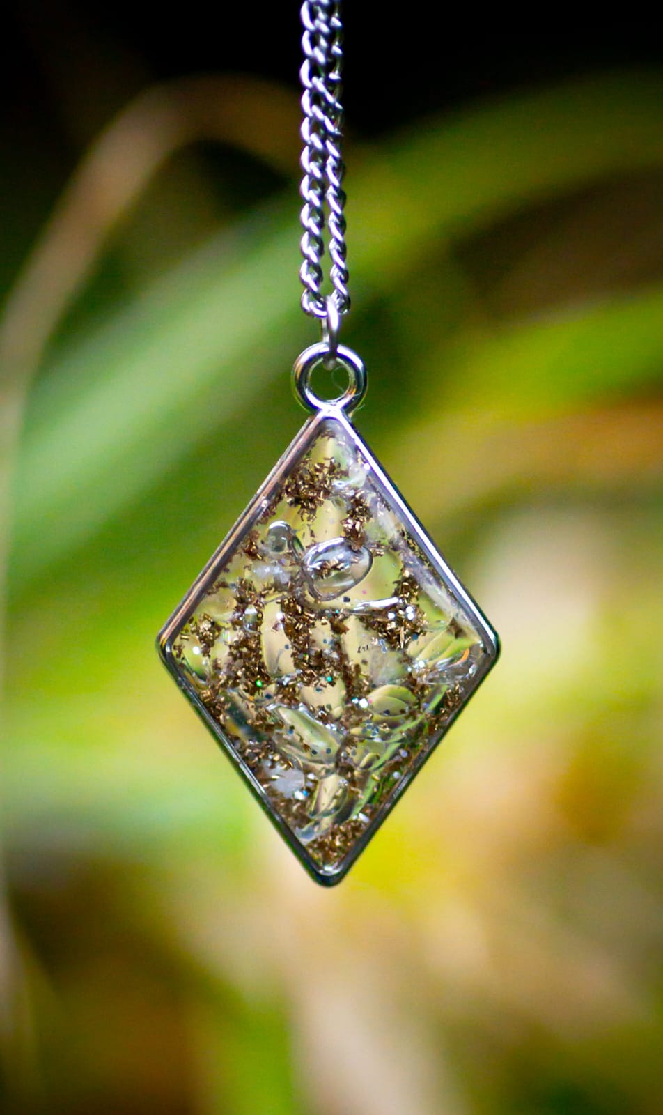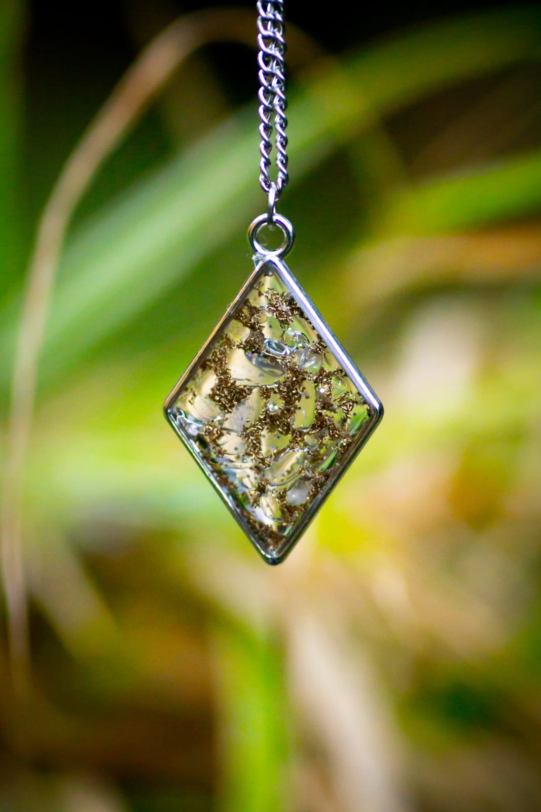 Náhrdelník je zavěšen na nerezovém řetízku.